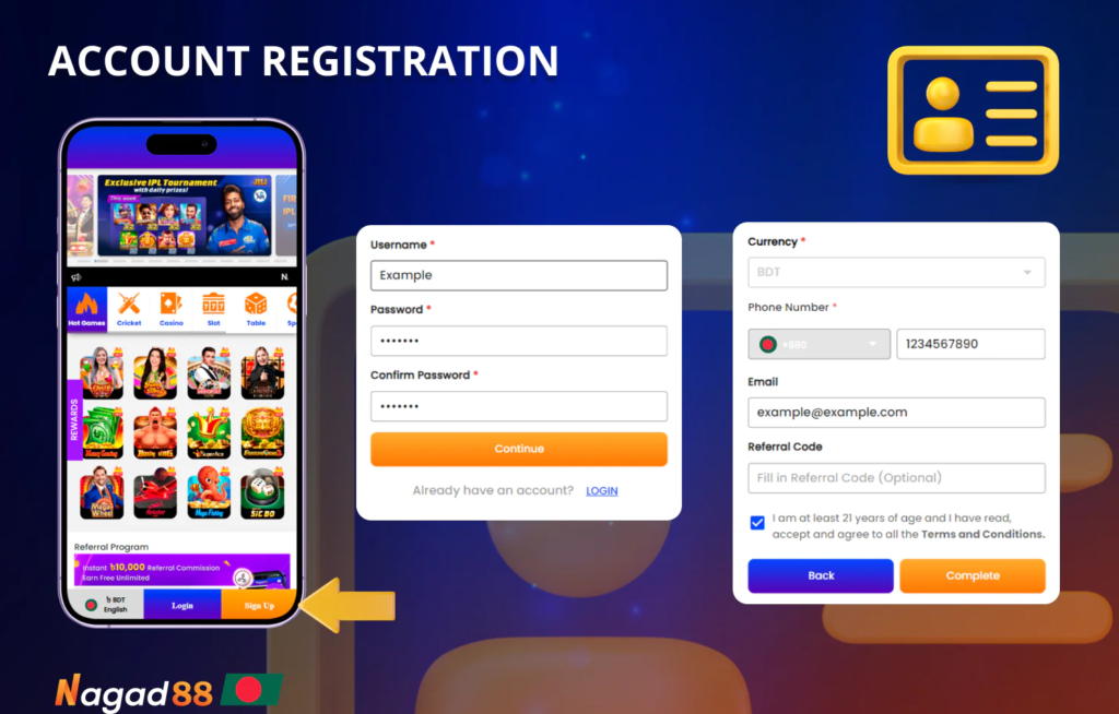 - Register. Open the Nagad88 app and click on the register button. Fill out the form, enter the promo code if you have one and create your personal gambling account;